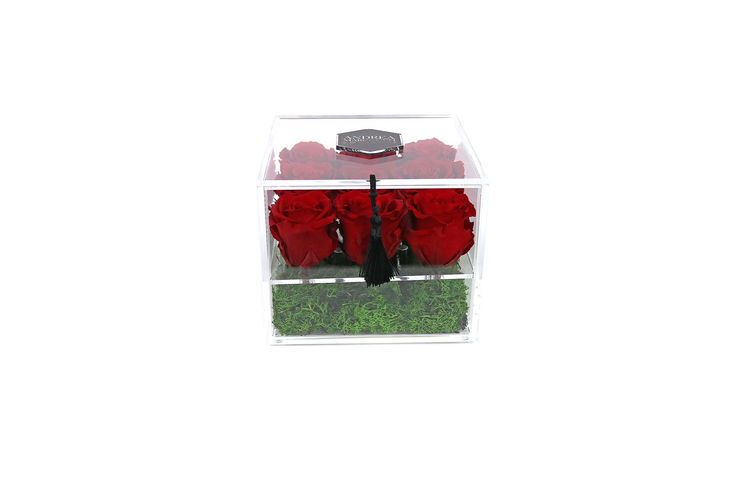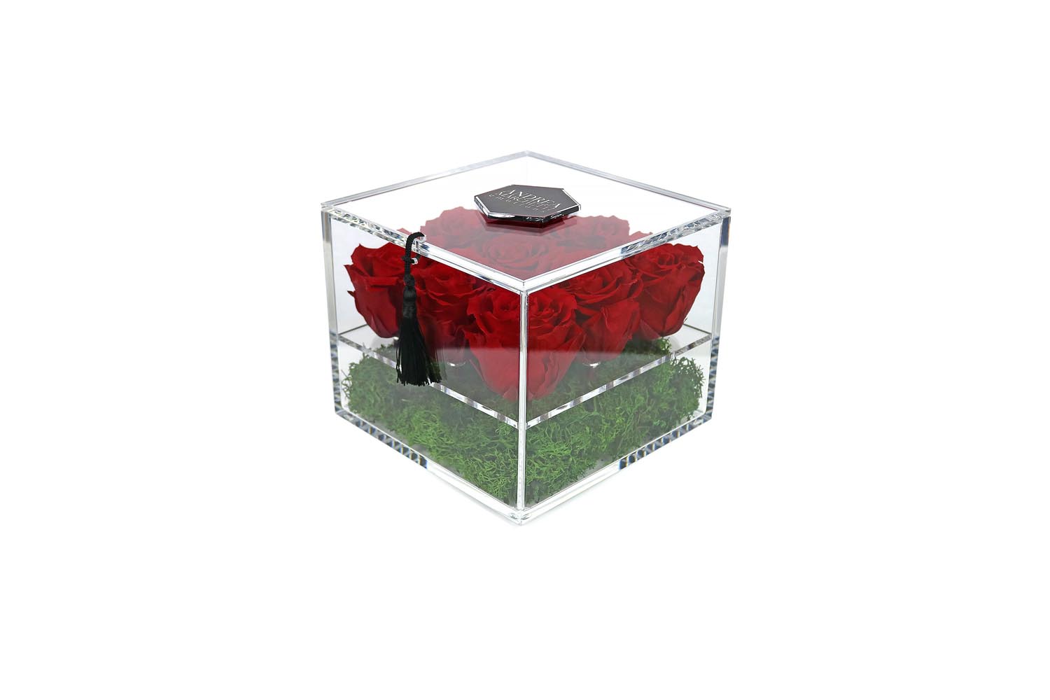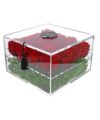 Un’elegante scatola in Plexiglas dal colore cristallo extra chiaro che racchiude al suo interno un giardino di rose “eterne”.